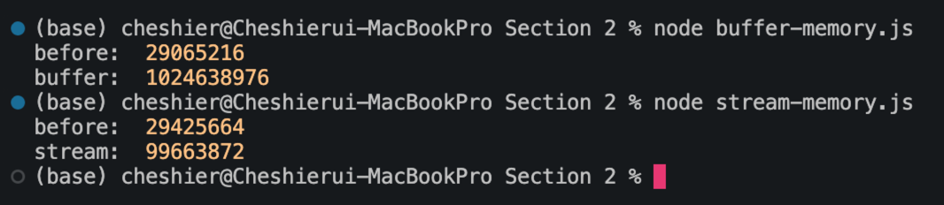 위 예제의 결과를 살펴보면 버퍼는 거의 대용량 파일의 크기만큼의 메모리를 사용하는 것을 확인할 수 있고, 스트림은 100MB도 안 쓰는 것을 확인할 수 있다.