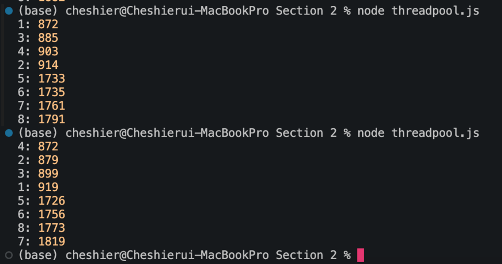 이 예제를 여러번 실행하면 아래와 같이 실행 순서와 시간이 매번 달라지는 것을 확인할 수 있다. 그리고 4개가 주루룩 찍히고 나머지 4개가 또 주루룩 찍히는 것도 확인할 수 있다.